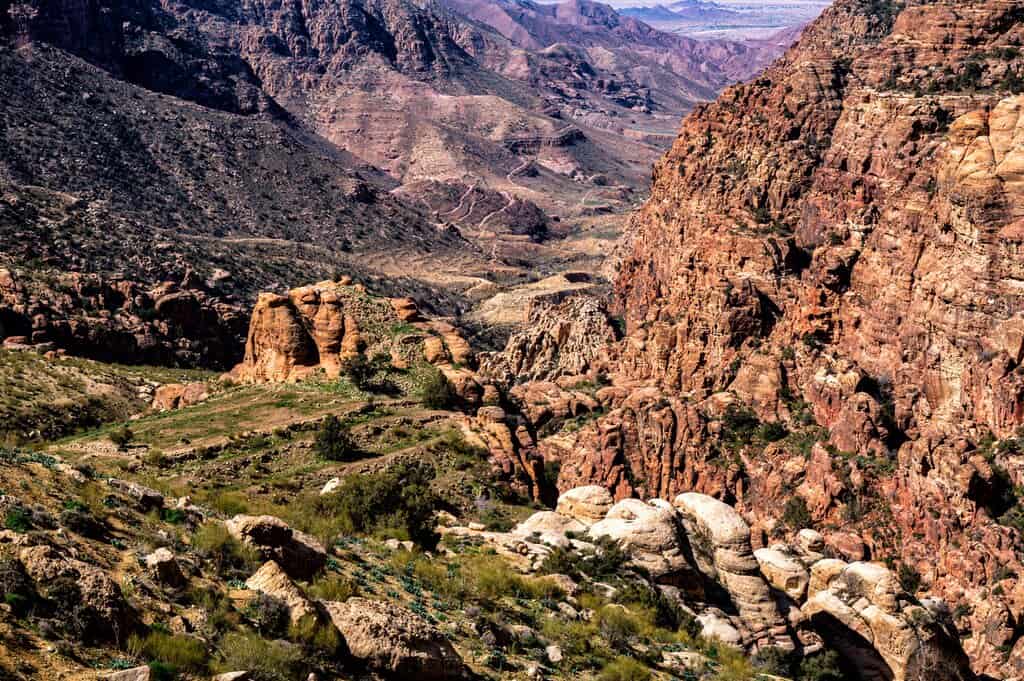 The trail winds through rugged sandstone cliffs, ancient agricultural terraces, and seasonal watercourses, passing remnants of historic copper-mining sites that reflect Dana’s long human history. As the path continues downward, the landscape gradually opens toward the vast expanse of the Wadi Araba Rift Valley, offering sweeping desert panoramas and a powerful sense of wilderness.